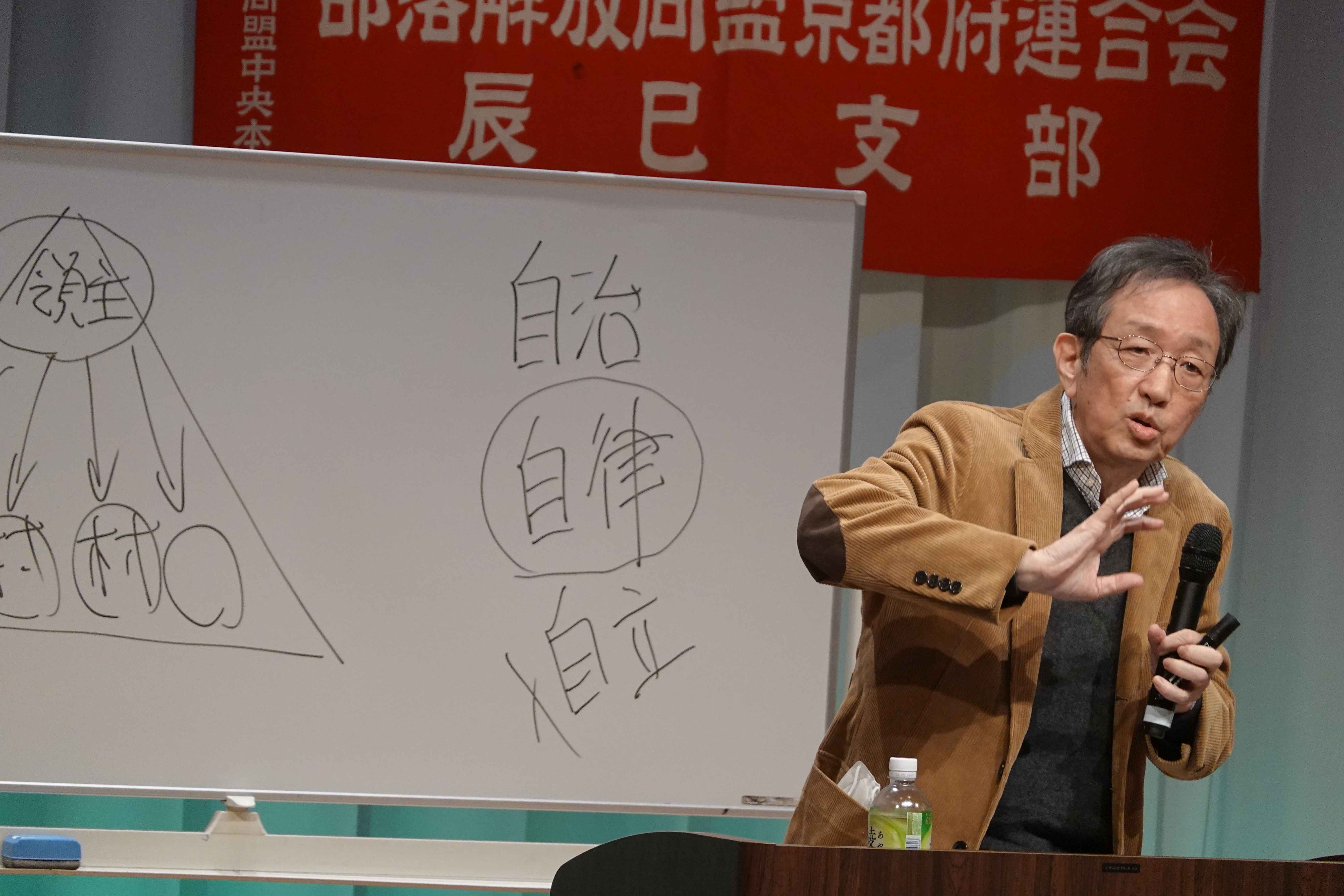 記念講演は「地域史から考える人権課題」と題して元奈良大学教諭の井岡康時さん。日本社会では自治・自律の意識が民衆に根づいていることを紹介し、地域のなかでの対話や協働する活動が差別意識解消のヒントに繋がると思いをのべました。