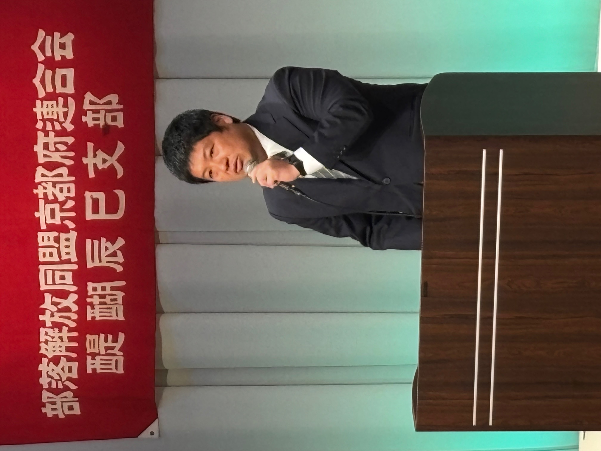 神原弘明支部長が主催者あいさつ。結成50周年記念誌を編纂した神原さんは「140人以上いた支部員は、同和行政の終結や京都市職員不祥事などで減少しました。ですが、生活水準の向上など支部が果たした役割は大きい」とし、解放への願いを受け継ぐ決意をのべました。