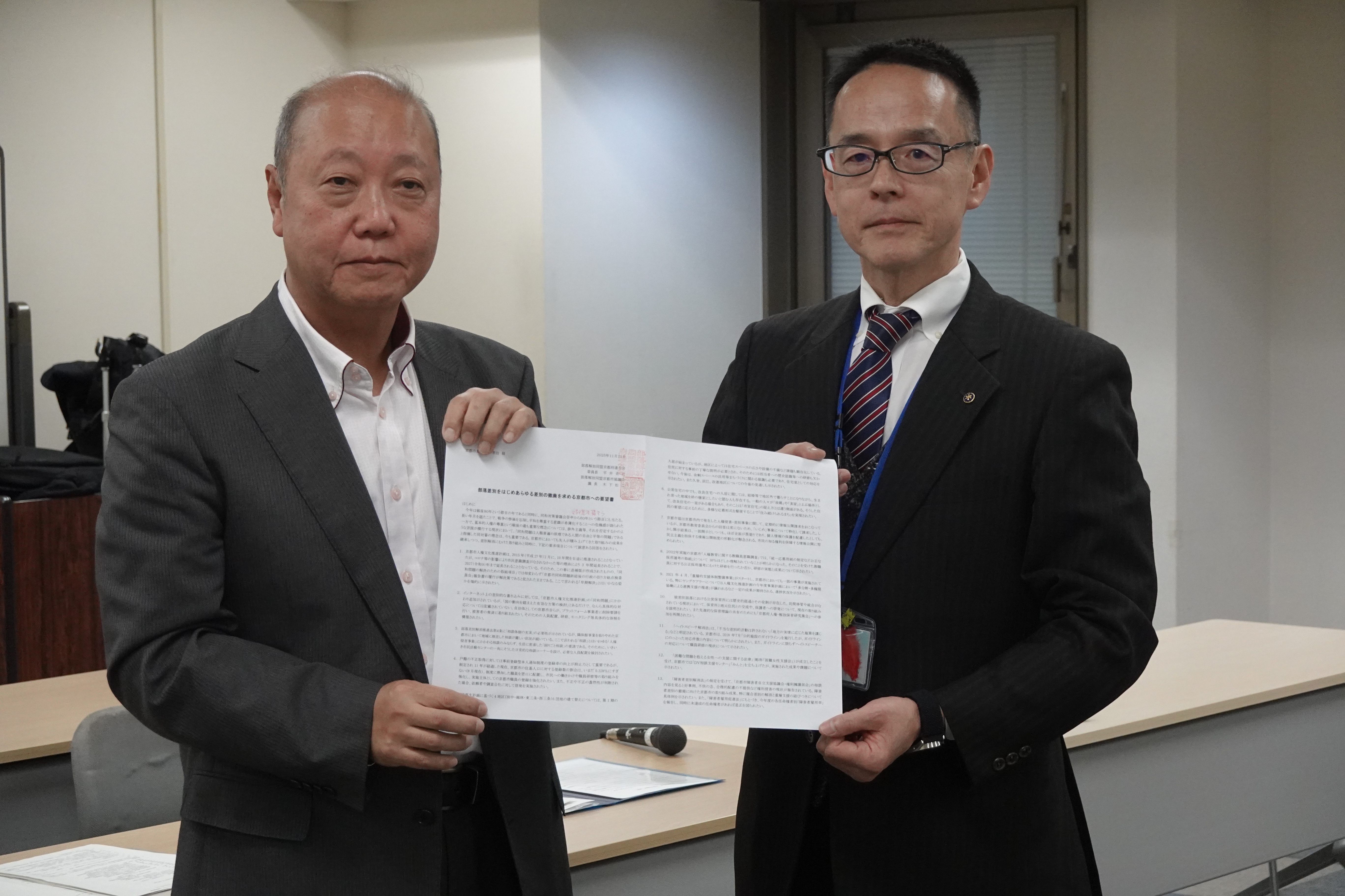 「部落問題をはじめあらゆる差別の撤廃を求める京都市への要望書」を木下議長から並川局長へ提出した後、要望書項目の順に各課との意見交換に入りました。