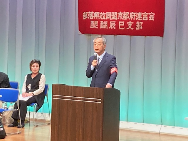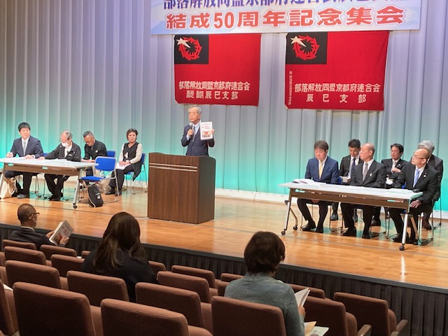 神原弘明支部長が主催者あいさつ。結成50周年記念誌を編纂した神原さんは「140人以上いた支部員は、同和行政の終結や京都市職員不祥事などで減少しました。ですが、生活水準の向上など支部が果たした役割は大きい」とし、解放への願いを受け継ぐ決意をのべました。