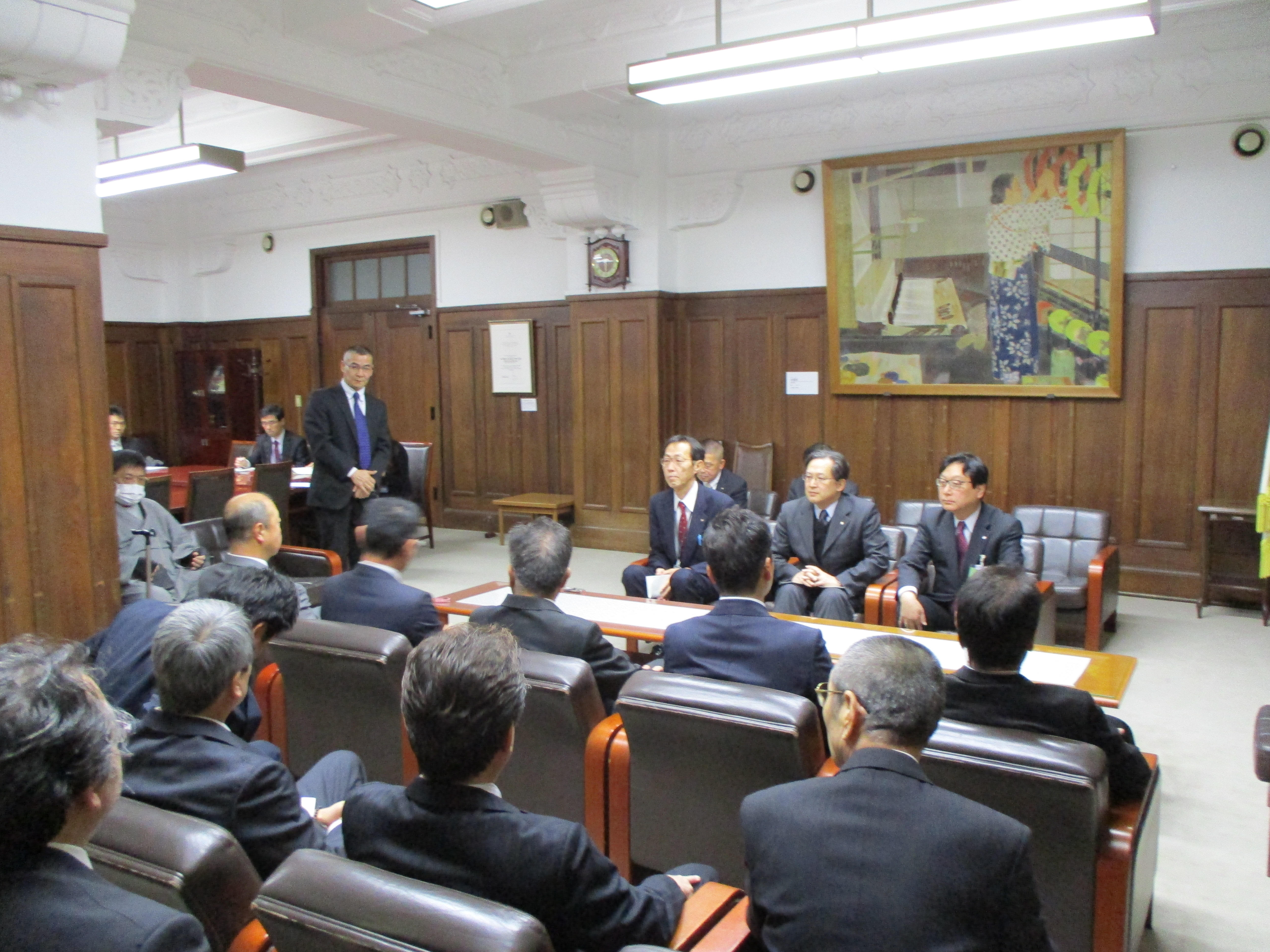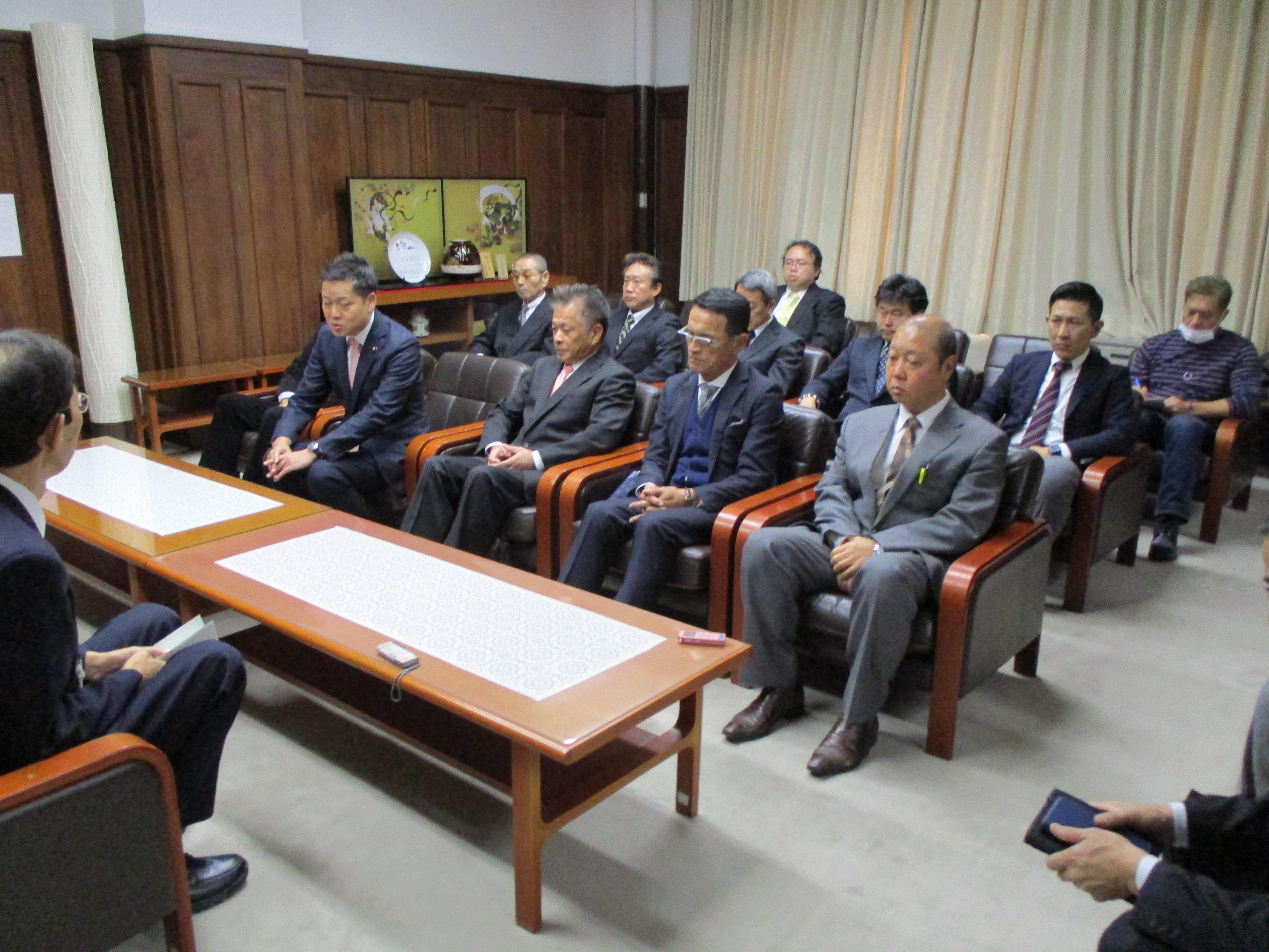 京都市協は宮崎茂議長をはじめ、市協役員、支部長ら12人、解放同盟京都府連からは平井斉己書記長が出席。京都市からは、藤田裕之副市長、文化市民局の寺井正局長、文化市民局くらし安全推進部共生社会推進の板倉康夫担当部長らが応じました。 宮崎議長は「昨年末に部落差別解消法が成立し、これから中央本部とも連携し具体化していきたい。右京区役所跡地に建設中の特別養護老人ホームも、体制がほぼ整い順調に進んでいる。聴覚障害を抱えた方も一緒に、福祉で人権のまちづくりを太秦で展開していきたい」と挨拶。次に平井書記長が「スタートとして大きく2点。一つは部落差別解消法。まだ法務省として大きな動きはないが、3月までを目途に方針が出てくると思う。与野党の枠を超えて、部落差別という名称をつけた法律ができたことは大きな前進だ。太秦の特養に関しては、開所以降も協力をお願いしたい」と述べました。
