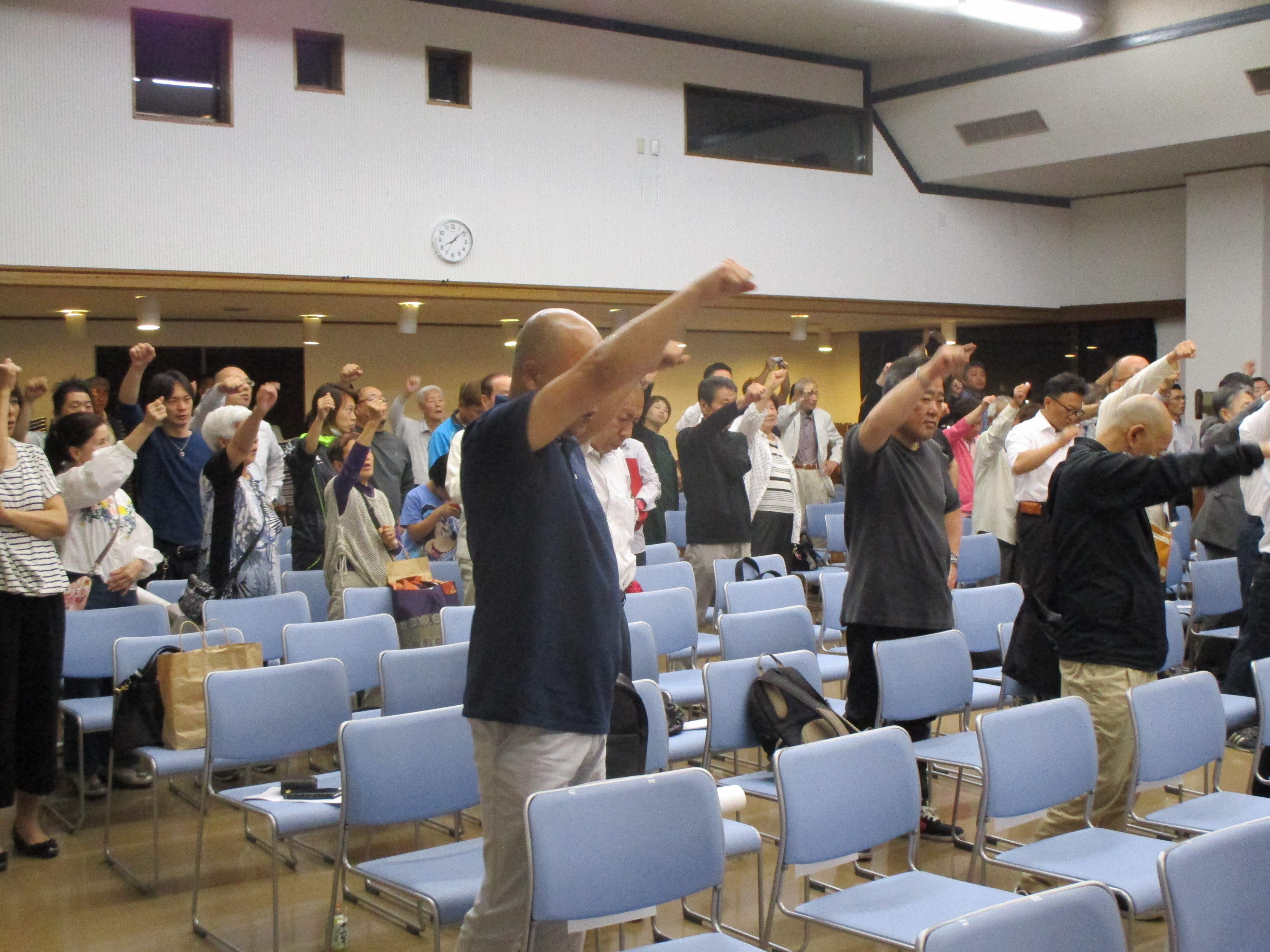 最後の議事である、総会宣言(案)の読み上げを木下松二副議長が行い、これも拍手で承認されました。 議長降壇の後、マイクが司会にもどり、「差別裁判打ち砕こう」の合唱。閉会挨拶は、新体制から、小林茂事務局次長が「京都市協を中心にこれからも、差別のない誰にとっても住みやすいまちづくりを進めていく」と述べ、全員の団結ガンバロウで、部落三大闘争勝利、選挙戦勝利に向けて、運動の前進を誓いました。